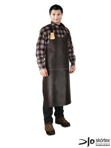 FSL (SK03-99) fartuch skórzany przedni, zakładany na szyję.- skóra bydlęca licowa pokryta z jednej strony powłoką poliuretanową- grubość skóry: 1,2-1,6 mm- u góry i w talii zapinany na klamrę- wykonany z dwóch płatów skóry połączonych nitami zaciskowymi (połączenie przykryte pojedynczą warstwą skóry)- ochrona przed iskrami i odpryskami płynnego metalu- polecany dla spawaczy- spełnia wymagania norm EN11611 i EN13688
