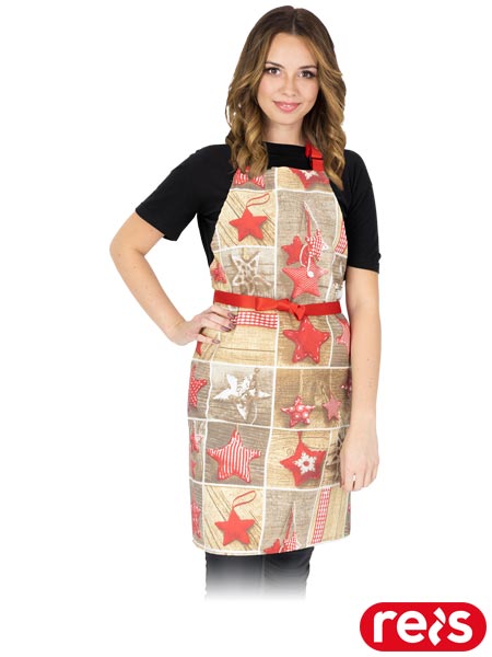 Fartuch z regulacją na szyi.- materiał: 100 % bawełna- gramatura: 245 g/m2- wiązany na paski z tyłu- długość paska na szyi regulowana za pomocą klamry- świąteczna kolorystyka i piękne wzornictwo