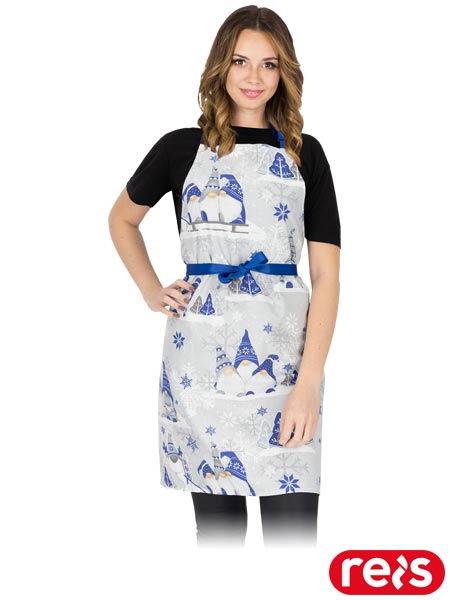 Fartuch z regulacją na szyi.- materiał: 100 % bawełna- gramatura: 245 g/m2- wiązany na paski z tyłu- długość paska na szyi regulowana za pomocą klamry- świąteczna kolorystyka i piękne wzornictwo