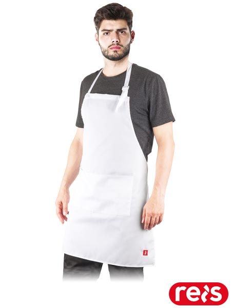 Fartuch przedni.- tkanina: 80% poliester, 20% bawełna- gramatura 180g/m2- na szyi zapinany na klamrę z możliwością regulacji długości- wiązany z tyłu na pasek dzięki czemu możliwe jest lepsze dopasowanie fartucha do sylwetki- dwie kieszenie w dolnej partii- idealny do pracy w gastronomii