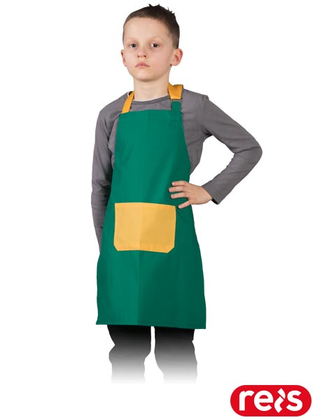 Fartuch dla dzieci.- 50% poliester, 50% bawełna- gramatura 180 g/m2- długość paska na szyi regulowana za pomocą klamry- wiązany z tyłu na paski o długości 50 cm- możliwość prania w temperaturze do 95°C, prasowania oraz suszenia w suszarce bębnowej na niskich obrotach- każda sztuka pakowana w osobną torebkę