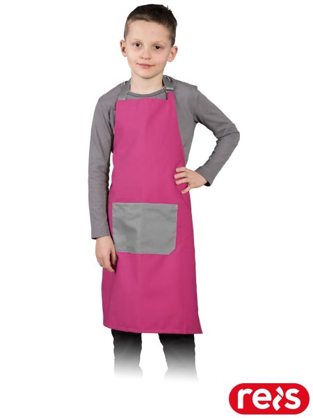 Fartuch dla dzieci.- 50% poliester, 50% bawełna- gramatura 180 g/m2- długość paska na szyi regulowana za pomocą klamry- wiązany z tyłu na paski o długości 50 cm- możliwość prania w temperaturze do 95°C, prasowania oraz suszenia w suszarce bębnowej na niskich obrotach- każda sztuka pakowana w osobną torebkę
