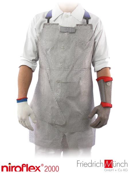 Fartuch ochronny przedni niroflex 2000.- wykonany ze stali nierdzewnej- przeznaczony dla operacji cięcia, w których noże skierowane są w kierunku ciała- zapewnia ochronę przed takimi urazami jak rany cięte i kłute tych części ciała, które są pokryte metalową siatką- stosowany podczas oddzielania mięsa od kości, przetwórstwa tworzyw sztucznych, skóry i podobnych materiałów- przeznaczony do pracy w systemie HACCP- średnica oczek - 7 mm- spełnia wymagania normy EN13998 (poziom 2)