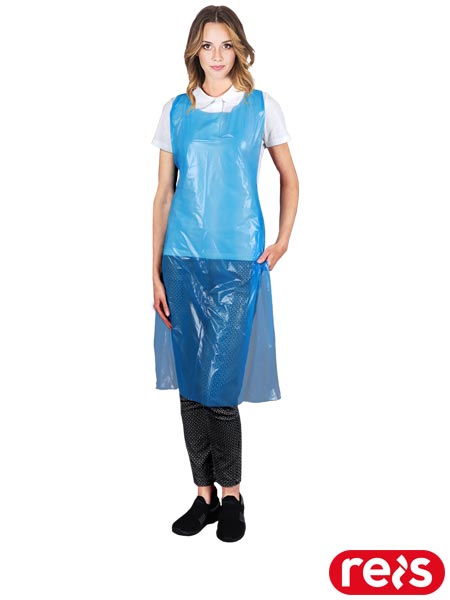 Fartuch przedni foliowy zakładany na szyję z wiązaniem z tyłu pleców.- wykonany z folii polietylenowej LDPE- grubość: 0,015 mm- wymiary: dł. 117 cm, szer. 70 cm- dopuszczony do kontaktu z żywnością- pakowany po 100 szt. w worku