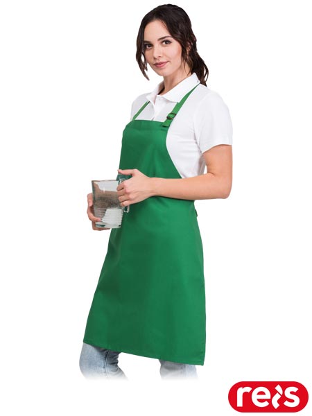 Fartuch z regulacją na szyi.- materiał: 65% poliester, 35% bawełna- gramatura: 245 g/m2- wiązany na paski z tyłu- długość paska na szyi regulowana za pomocą klamry- możliwość prania (bez nadruku) do 60°C
