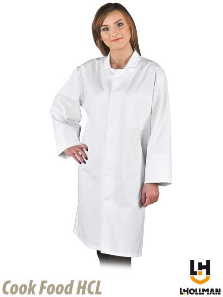 Fartuch ochronny, damski.- tkanina: 65% poliester, 35% bawełna- gramatura 200 g/m2- zapinany na zatrzaski- wykończony kołnierzykiem- dwie kieszenie wewnętrzne z lewej strony - w górnej i dolnej partii- przystosowany do pracy w systemie HACCP (przemysł spożywczy)- odpowiedni do prania przemysłowego (maksymalna temperatura 95°C)