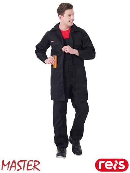 Fartuch ochronny MASTER, męski.- tkanina: 65% poliester, 35% bawełna- gramatura 240 g/m2- zapinany na guziki- dwie kieszenie w dolnej części oraz dwie na klatce piersiowej zapinane na rzep- rękawy zakończone zapięciem na guziki