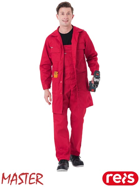 Fartuch ochronny MASTER, męski.- tkanina: 65% poliester, 35% bawełna- gramatura 240 g/m2- zapinany na guziki- dwie kieszenie w dolnej części oraz dwie na klatce piersiowej zapinane na rzep- rękawy zakończone zapięciem na guziki