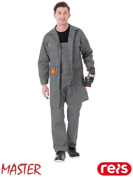 Fartuch ochronny MASTER, męski.- tkanina: 65% poliester, 35% bawełna- gramatura 240 g/m2- zapinany na guziki- dwie kieszenie w dolnej części oraz dwie na klatce piersiowej zapinane na rzep- rękawy zakończone zapięciem na guziki