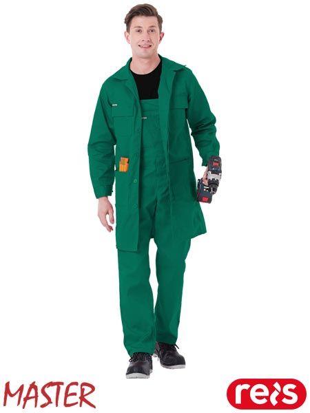 Fartuch ochronny MASTER, męski.- tkanina: 65% poliester, 35% bawełna- gramatura 240 g/m2- zapinany na guziki- dwie kieszenie w dolnej części oraz dwie na klatce piersiowej zapinane na rzep- rękawy zakończone zapięciem na guziki