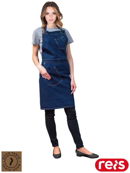 Fartuch ochronny wykonany z jeansu zakładany na szyję.- tkanina: 100% bawełna- gramatura 340 g/m2- wiązany z tyłu na pasek dzięki czemu możliwe jest lepsze dopasowanie do sylwetki- rozmiar 82x82 cm posiada trzy kieszenie po zewnętrznej stronie w tym dwie po środku w dolnej części oraz jedna w górnej części- rozmiar 90x115 cm posiada trzy kieszenie po zewnętrznej stronie w tym dwie po bokach oraz jedna w górnej części- rozmiar 90x88 cm posiada cztery kieszenie po zewnętrznej stronie w tym dwie po bokach, jedna w górnej części oraz jedna w dolnej części- dodatkowa szlufka na ścierkę- pranie w temperaturze do 30°C