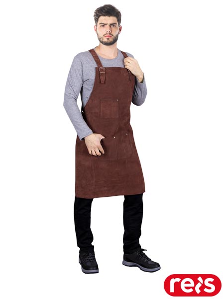 Fartuch skórzany przedni.- skóra bydlęca dwoinowa zamszowa- grubość skóry: 1,2-1,6 mm- paski zapinane z przodu na metalowe klamry z możliwością regulacji długości- wykonany z jednego płata skóry- posiada trzy kieszenie po zewnętrznej stronie w tym dwie po środku oraz jedna w górnej części- doskonały dla rzemieślnika- stanowi zabezpieczenie przed działaniami minimalnego ryzyka, przed działaniami czynników mechanicznych, których skutki są powierzchniowe