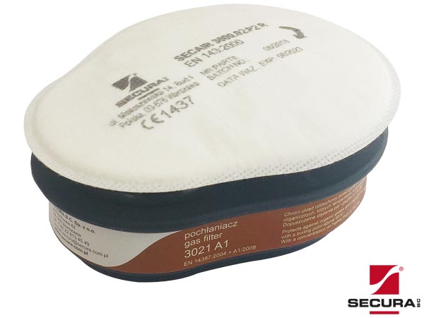 Filtropochłaniacz 3041 A1P2 R D.- składa się z pochłaniacza 3021 A1 oraz filtra SECAIR 3000.02 P2 R- stanowi ochronę przed gazami organicznymi i parami substancji organicznych, których temperatura wrzenia jest wyższa niż 65 °C w warunkach występowania również pyłów, dymów i mgieł- dopuszczalne stężenie par i gazów wynosi 0.1% objętości, a stężenie fazy rozproszonej aerozolu nie może przekraczać wartości 10 x NDS w przypadku skompletowania z półmaską (16,5 x NDS w przypadku skompletowania z maską)- małe opakowanie zawiera 2 szt.- spełnia wymagania normy EN14387
