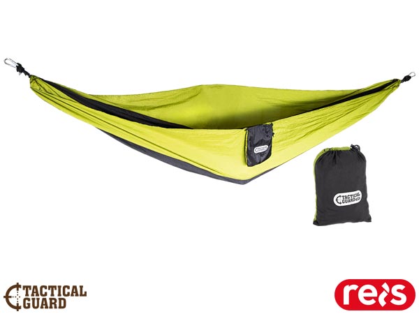 Hamak Tactical Guard.- tkanina: 100% nylon 210T o gramaturze 61 g/m2- wymiary: 270x140 cm- do montażu służą dwie liny o długości 2 metrów oraz dwa karabińczyki- kieszeń znajdująca się w bocznej części, jednocześnie pełni funkcję pokrowca transportowego po złożeniu- maksymalne obciążenie 200 kg- lekki i wytrzymały- sprawdzi się podczas biwaku, kempingu, pieszej wędrówki lub wypoczynku na działce