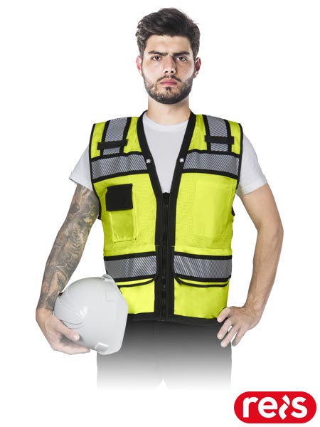 Kamizelka ostrzegawcza z siateczki, męska.- dzianina: 100% poliester- gramatura 130 g/m2- zapinana na zamek błyskawiczny- suwaki po bokach zapewniające lepszą wentylację- kieszenie na klatce piersiowej, w tym jedna na telefon zapinana na rzep oraz jedna podwójna z miejscem na przybory np. długopisy- dwie kieszenie po bokach w dolnej części zapinane na rzepy- uchwyty na latarkę- wykończona czarną lamówką- segmentowe pasy odblaskowe zwiększające widoczność- idealna dla drogowców