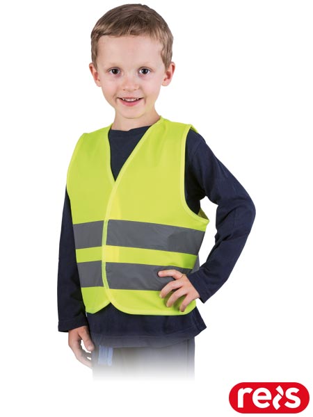 Kamizelka ostrzegawcza dla dzieci.- dzianina: 100% poliester- gramatura 120 g/m2- wymiary: S - 45x40 cm, M - 55x46 cm- zapinana na rzep- dwa poziome pasy odblaskowe zwiększające widoczność- zapewnia bezpieczeństwo w ruchu ulicznym