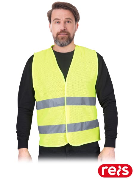 Kamizelka ostrzegawcza z siateczki, męska.- dzianina: 100% poliester- gramatura 120 g/m2- zapinana na rzep- dwa poziome pasy odblaskowe zwiększające widoczność- idealna dla drogowców- spełnia wymogi normy EN ISO 20471 (klasa 2)