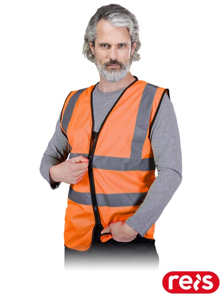Kamizelka ostrzegawcza z siateczki, męska.- dzianina: 100% poliester- gramatura 130 g/m2- zapinana na zamek błyskawiczny- wykończona czarną lamówką- pasy odblaskowe zwiększające widoczność- idealna dla drogowców- fason: REGULAR