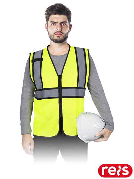 Kamizelka ostrzegawcza z siateczki, męska.- dzianina: 100% poliester- gramatura 130 g/m2- zapinana na suwak- uchwyt na latarkę- wykończona czarną lamówką- pasy odblaskowe zwiększające widoczność- idealna dla drogowców