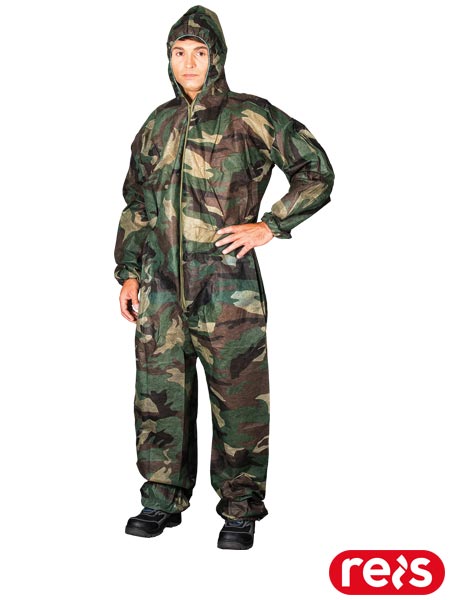 Kombinezon.- 100% polipropylen- gramatura 50 g/m2- zapinany na suwak- kaptur, brzegi rękawów oraz nogawek wykończone gumkami ściągającymi, dzięki czemu kombinezon zapewnia większą szczelność- marszczenie w pasie umożliwia lepsze dopasowanie się do sylwetki użytkownika- kolor moro zapewnia świetny kamuflaż- polecany dla leśników, myśliwych, przy pracach malarskich oraz porządkowych