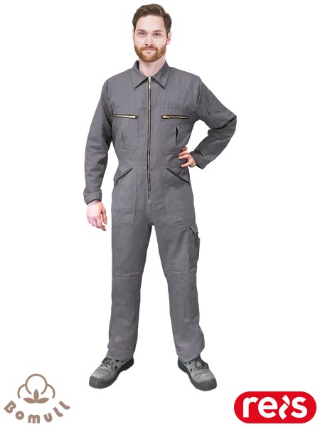 Kombinezon ochronny BOMULL.- tkanina: 100% bawełna- gramatura 260-270 g/m2- zapinany na suwak- przy karku wykończony kołnierzykiem- osiem kieszeni: dwie kieszenie na klatce piersiowej zasuwane na suwak, dwie boczne, dwie tylne na napy oraz dwie na nogawkach- dodatkowa kieszeń na rękawie- gumka w pasie w tylnej partii zwiększa swobodę ruchów oraz umożliwia lepsze dopasowanie- rękawy wykończone zapięciem na napy- na kolanach dodatkowe wzmocnienie co zwiększa wytrzymałość spodni na przetarcia- system wentylacji pod pachami umożliwia cyrkulację powietrza i zwiększa komfort użytkowania