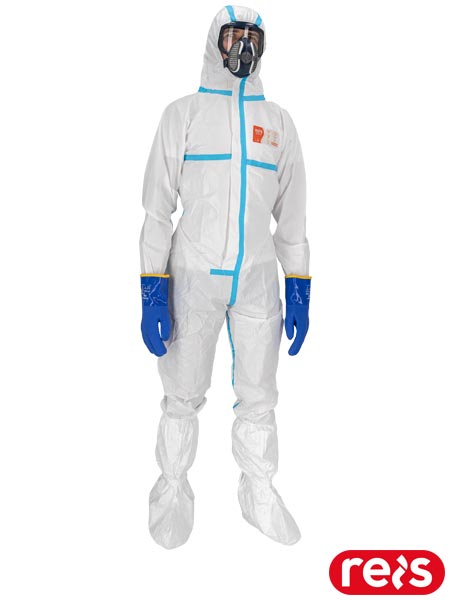 Kombinezon ochronny COV-456.- włóknina: 100% polipropylen- gramatura 63 g/m2- powlekany mikroporowatym filmem, który tworzy doskonałą warstwę ochronną- doskonała ochrona przed oparami cieczy, cząstkami stałymi oraz lekkimi rozpyleniami oraz rozpryskami (typ 4-B/5-B/6-B)- zapinany na suwak- kaptur, brzegi rękawów oraz nogawek wykończone gumkami ściągającymi, dzięki czemu kombinezon zapewnia większą szczelność- marszczenie w pasie umożliwia lepsze dopasowanie się do sylwetki użytkownika- niebieska taśma zabezpieczająca szwy, zapewnia dodatkową ochronę- znajduje zastosowanie w rolnictwie i sadownictwie