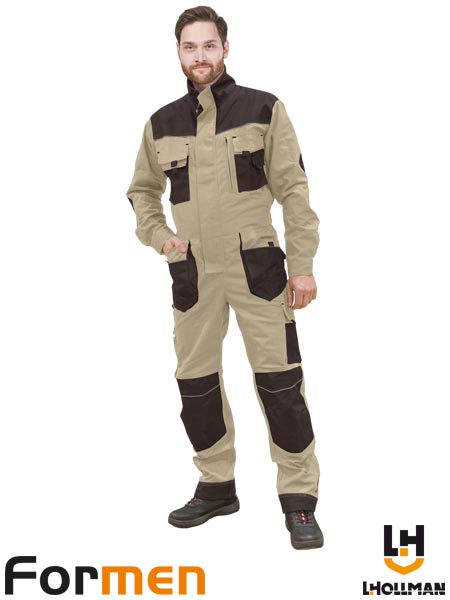Kombinezon ochronny FORMEN, męski.- materiał główny: tkanina o splocie canvas 65% poliester, 35% bawełna o gramaturze 270g/m2- wstawki: tkanina 100% poliester Oxford 600D o gramaturze 240 g/m2 oraz elementy z tkaniny Cordura 100% nylon 500D o gramaturze 200 g/m2- zapinany na dwustronny zamek błyskawiczny z dodatkowym zapięciem na rzepy- kołnierz w formie stójki- pięć kieszeni na klatce piersiowej z dodatkowymi wąskimi kieszonkami na przybory np. długopis- dwie podwójne kieszenie boczne oraz dwie tylne zapinane na rzep- kieszenie na nogawkach, w tym jedna zapinana na rzep z dodatkowymi kieszonkami na akcesoria oraz jedna podłużna z przegródkami- kieszenie na wkładki nakolannikowe wkładane od góry z zapięciem na rzep- wyprofilowane kolana- gumka w pasie w tylnej partii umożliwiająca lepsze dopasowanie- końcówka do przypięcia kluczy- uchwyt na młotek na prawej nogawce- rękawy zakończone zapięciem na napy- odblaskowe elementy- fason: REGULAR– testowane na zawartość szkodliwych dla zdrowia substancji zgodnie ze standardami OEKO-TEX® Standard 100