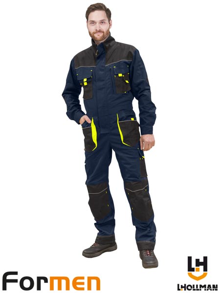 Kombinezon ochronny FORMEN, męski.- materiał główny: tkanina o splocie canvas 65% poliester, 35% bawełna o gramaturze 270g/m2- wstawki: tkanina 100% poliester Oxford 600D o gramaturze 240 g/m2 oraz elementy z tkaniny Cordura 100% nylon 500D o gramaturze 200 g/m2- zapinany na dwustronny zamek błyskawiczny z dodatkowym zapięciem na rzepy- kołnierz w formie stójki- pięć kieszeni na klatce piersiowej z dodatkowymi wąskimi kieszonkami na przybory np. długopis- dwie podwójne kieszenie boczne oraz dwie tylne zapinane na rzep- kieszenie na nogawkach, w tym jedna zapinana na rzep z dodatkowymi kieszonkami na akcesoria oraz jedna podłużna z przegródkami- kieszenie na wkładki nakolannikowe wkładane od góry z zapięciem na rzep- wyprofilowane kolana- gumka w pasie w tylnej partii umożliwiająca lepsze dopasowanie- końcówka do przypięcia kluczy- uchwyt na młotek na prawej nogawce- rękawy zakończone zapięciem na napy- odblaskowe elementy- fason: REGULAR– testowane na zawartość szkodliwych dla zdrowia substancji zgodnie ze standardami OEKO-TEX® Standard 100