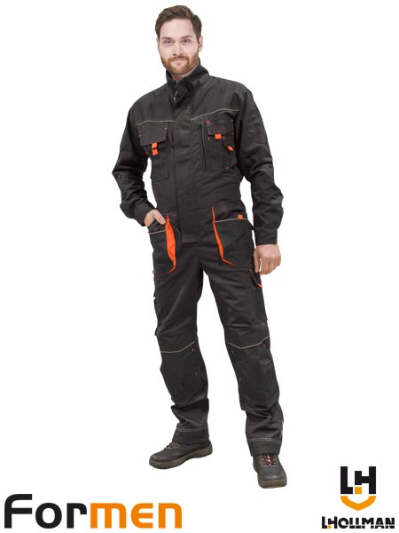 Kombinezon ochronny FORMEN, męski.- materiał główny: tkanina o splocie canvas 65% poliester, 35% bawełna o gramaturze 270g/m2- wstawki: tkanina 100% poliester Oxford 600D o gramaturze 240 g/m2 oraz elementy z tkaniny Cordura 100% nylon 500D o gramaturze 200 g/m2- zapinany na dwustronny zamek błyskawiczny z dodatkowym zapięciem na rzepy- kołnierz w formie stójki- pięć kieszeni na klatce piersiowej z dodatkowymi wąskimi kieszonkami na przybory np. długopis- dwie podwójne kieszenie boczne oraz dwie tylne zapinane na rzep- kieszenie na nogawkach, w tym jedna zapinana na rzep z dodatkowymi kieszonkami na akcesoria oraz jedna podłużna z przegródkami- kieszenie na wkładki nakolannikowe wkładane od góry z zapięciem na rzep- wyprofilowane kolana- gumka w pasie w tylnej partii umożliwiająca lepsze dopasowanie- końcówka do przypięcia kluczy- uchwyt na młotek na prawej nogawce- rękawy zakończone zapięciem na napy- odblaskowe elementy- fason: REGULAR– testowane na zawartość szkodliwych dla zdrowia substancji zgodnie ze standardami OEKO-TEX® Standard 100