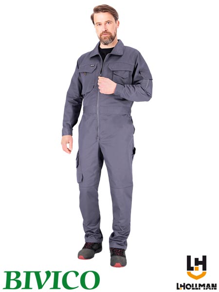 Kombinezon ochronny, męski.- tkanina: 65% poliester, 35% bawełna- gramatura 270 g/m2- zapinany na dwustronny zamek błyskawiczny- dwie kieszenie na klatce piersiowej, w tym jedna podwójna zapinane na napy- dwie kieszenie boczne oraz dwie tylne zapinane na napy- trzy kieszenie na nogawkach, w tym jedna podłużna z przegródkami- kieszenie na wkładki nakolannikowe wkładane od dołu- na lewym rękawie podwójna kieszeń z przegródkami- gumka w pasie w tylnej partii umożliwiająca lepsze dopasowanie- zaczep na identyfikator- końcówka do przypięcia kluczy- rękawy zakończone zapięciem na rzep, umożliwiającym regulację ich szerokości