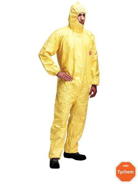 Lekki kombinezon ochronny Tychem®2000 C Classic Plus, model CHA5a, wykonany z materiału Tychem®- bariera ochronna zgodna z kategorią III odzieży ochronnej, typ 3, 3b, 4, 5 & 6- zapewnia ochronę przed cząstkami radioaktywnymi, włóknami, krwią, wirusami i bakteriami- gwarantuje 100% szczelność przed przenikaniem cząstek pyłu i natryskiem cieczy o ciśnieniu do 2 barów- zamek zakryty podwójna samoprzylepną patką ochronną- kaptur z gumką dopasowującą go do twarzy oraz patką samoprzylepną pod brodą- szwy zaklejone taśmą zapewniają ochronę- elastyczne mankiety rękawów i nogawek- gumka w talii dopasowuje ubiór do ciała- posiada właściwości antyelektrostatyczne- chroni przed radioaktywnymi cząstkami stałymi oraz przed zagrożeniami biologicznymi- sprawdza się w kontakcie ze środkami chemicznymi stosowanymi w przemyśle chemicznym, do usuwania materiałów niebezpiecznych, utylizacji śmieci- znajduje zastosowanie w pracach przy usuwaniu azbestu- spełnia wymagania norm EN14605, EN13982-1, EN13034, EN1149-5, EN1073-2 oraz EN14126