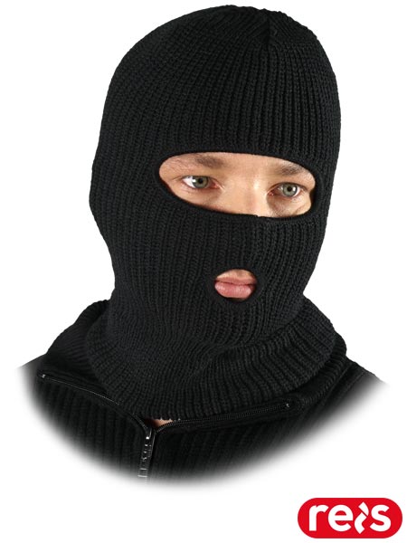 Czapka kominiarka z dwoma otworami na usta i oczy.- dzianina: 100% przędza akrylowa- waga sztuki około 80 g- doskonale chroni przed zimnem- zakrywa szczególnie narażone na wiatr i mróz policzki oraz nos