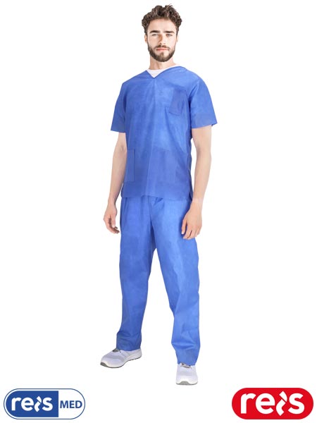 Komplet higieniczny.- trójwarstwowa włóknina: SMS (Spunbond/Meltblown/Spunbond)- gramatura: 35 g/m2- zestaw zawiera bluzę oraz spodnie do pasa- bluza posiada dekolt w kształcie V, krótki rękaw oraz trzy kieszenie- spodnie posiadają wiązaną regulację pasa biodrowego oraz kieszeń zewnętrzną tylną- każda sztuka pakowana w osobną torebkę- idealnie sprawdzi się w środowisku bloku operacyjnego, zapewniając komfort oraz higienę podczas procedur medycznych
