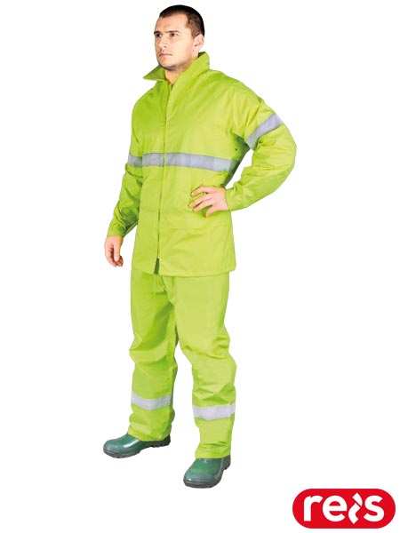 Komplet przeciwdeszczowy.- tkanina: 100% poliester powlekany PVC- gramatura 170 g/m2- zestaw zawiera spodnie do pasa i kurtkę- klejone szwy stanowią dodatkowe zabezpieczenie przed dostaniem się wody- kurtka: zapinana na suwak; kaptur ściągany na troczki schowany w kołnierzu; dwie kieszenie w dolnej część kurtki z zakładkami zabezpieczającymi przed dostaniem się do nich wody; możliwość zwężenia rękawów za pomocą nap oraz ściągany na troczki dół kurtki zapewniają lepszą ochronę przed wiatrem; system wentylacji pod pachami zapewnia niezbędną cyrkulację powietrza- spodnie: wykończone w pasie rozciągliwą gumką; dwie boczne kieszenie; możliwość zwężenia dołu nogawek za pomocą nap, co zapewnia lepszą ochronę przed wiatrem- pasy odblaskowe zwiększające widoczność- pakowany w saszetkę- doskonale sprawdza się w złych warunkach pogodowych