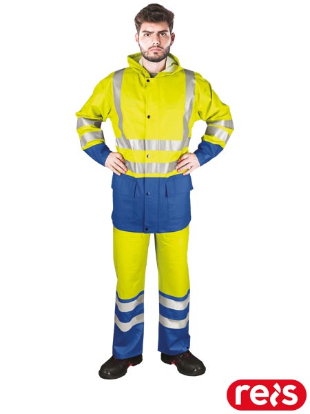 Wysokiej jakości komplet przeciwdeszczowy z elastycznego materiału o wysokiej wytrzymałości.- wykonany z PU/PCV- grubość: 0.50 mm- wyściółka wykonana z poliestru- elastyczny, dzięki czemu nie ogranicza ruchów i zapewnia dużą swobodę oraz wygodę podczas użytkowania- kurtka i spodnie ogrodniczki zapakowane w torebkę zamykaną na napy z dodatkowym wieszakiem- kurtka: zapięcie na suwak z dodatkową zakładką na napy szczelnie zasłania szczeliny suwaka przed dostaniem się deszczu i wiatru. Kaptur ściągany na troczki. Dwie duże kieszenie w dolej część kurtki z zakładkami zabezpieczającymi przed dostaniem się do nich wody. Od wewnątrz rękawy zakończone ściągaczem doskonale chronią przed dostaniem się wiatru. Ściągacz na dole kurtki. System wentylacji na plecach oraz pod pachami zapewnia niezbędną cyrkulację powietrza.- spodnie: możliwość regulacji w długości szelkami. Trzy kieszenie. Możliwość zwężenia dołu nogawek za pomocą nap, co zapewnia lepszą ochronę przed wiatrem. Pasy odblaskowe na dole nogawek oraz w pasie.- doskonale sprawdza się w złych warunkach pogodowych- pasy zgodne z normami EN ISO 20471