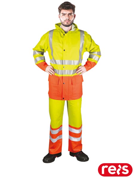 Wysokiej jakości komplet przeciwdeszczowy z elastycznego materiału o wysokiej wytrzymałości.- wykonany z PU/PCV- grubość: 0.50 mm- wyściółka wykonana z poliestru- elastyczny, dzięki czemu nie ogranicza ruchów i zapewnia dużą swobodę oraz wygodę podczas użytkowania- kurtka i spodnie ogrodniczki zapakowane w torebkę zamykaną na napy z dodatkowym wieszakiem- kurtka: zapięcie na suwak z dodatkową zakładką na napy szczelnie zasłania szczeliny suwaka przed dostaniem się deszczu i wiatru. Kaptur ściągany na troczki. Dwie duże kieszenie w dolej część kurtki z zakładkami zabezpieczającymi przed dostaniem się do nich wody. Od wewnątrz rękawy zakończone ściągaczem doskonale chronią przed dostaniem się wiatru. Ściągacz na dole kurtki. System wentylacji na plecach oraz pod pachami zapewnia niezbędną cyrkulację powietrza.- spodnie: możliwość regulacji w długości szelkami. Trzy kieszenie. Możliwość zwężenia dołu nogawek za pomocą nap, co zapewnia lepszą ochronę przed wiatrem. Pasy odblaskowe na dole nogawek oraz w pasie.- doskonale sprawdza się w złych warunkach pogodowych- pasy zgodne z normami EN ISO 20471