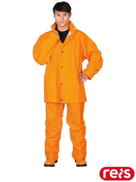 Wysokiej jakości komplet przeciwdeszczowy z elastycznego materiału o wysokiej wytrzymałości.- wykonany z PU/PCV- grubość: 0.50 mm- wyściółka wykonana z poliestru- elastyczny, dzięki czemu nie ogranicza ruchów i zapewnia dużą swobodę oraz wygodę podczas użytkowania- kurtka i spodnie zapakowane w torebkę zamykaną na napy z dodatkowym wieszakiem- kurtka: zapięcie na suwak z dodatkową zakładką na napy szczelnie zasłania szczeliny suwaka przed dostaniem się deszczu i wiatru. Kaptur ściągany na troczki schowany w kołnierzu. Dwie duże kieszenie w dolnej część kurtki z zakładkami zabezpieczającymi przed dostaniem się do nich wody. Od wewnątrz rękawy zakończone ściągaczem doskonale chronią przed dostaniem się wiatru. Ściągacz na dole kurtki. System wentylacji na plecach oraz pod pachami zapewnia niezbędną cyrkulację powietrza.- spodnie: wykończone w pasie rozciągliwą gumką. Dodatkowe napy w pasie pozwalają na regulacje tęgości. Rozsuwane nogawki z zapięciami na napy pozwalają regulować ich szerokość, aby uszczelnić dół nogawki czy ułatwić zakładanie gumowców.- doskonale sprawdza się w złych warunkach pogodowych