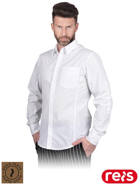 Koszula z długim rękawem, męska.- tkanina: 65% poliester, 35% bawełna- gramatura 110 g/m2- zapinana na guziki- przy karku wykończona kołnierzykiem- zewnętrzna kieszeń na klatce piersiowej po lewej stronie- rękawy zakończone eleganckimi mankietami z guzikami z możliwością wywinięcia i zapięcia- pranie w temperaturze do 60°C- idealna zarówno do pracy, jak i do codziennego użytkowania