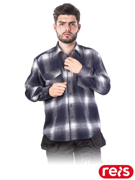 Jesienno – zimowa koszula, męska.- tkanina: 100% poliester- gramatura 150 g/m2- zapinana na guziki- wykończona kołnierzykiem- długi rękaw- dwie kieszonki na kltce piersiowej zapinane na guziki- idealna na chłodniejsze dni