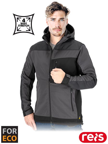 Kurtka ochronna, męska.- materiał główny: trójwarstwowa tkanina softshell z 4-kierunkowego stretchu 96% poliester, 4% elastan, membrana TPU, polar 100% poliester o gramaturze 280 g/m2- wstawki: tkanina 100% poliester Oxford o gramaturze 200 g/m2- materiał SOFTSHELL - chroni przed deszczem oraz wiatrem, a jednocześnie pozwala skórze oddychać- 4-kierunkowy stretch - materiał, który rozciąga się we wszystkich kierunkach- zapinana na zamek błyskawiczny- kołnierz w formie stójki ocieplany polarem- odsuwany kaptur ściągany na troczki z dodatkowym zapięciem na rzep dla lepszej ochrony głowy przed chłodem- dwie kieszenie w dolnej części oraz jedna na klatce piersiowej zapinane na suwak- rękawy zakończone na rzep, umożliwiające regulację ich szerokości- dół kurtki z możliwością ściągnięcia za pomocą troczków- idealnie sprawdza się nie tylko podczas pracy, ale również uprawiania sportów- fason: REGULAR