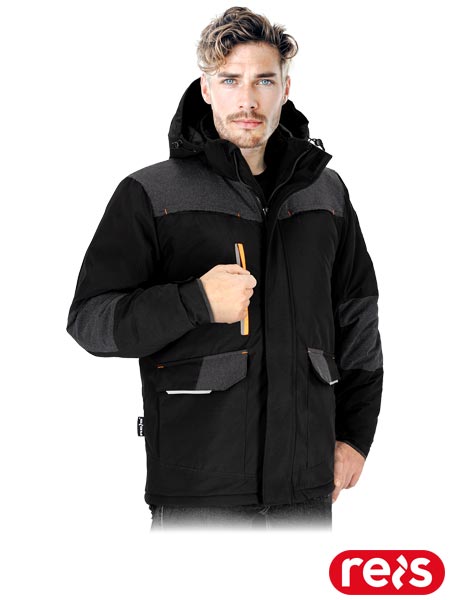 Kurtka ochronna ocieplana, męska.- materiał główny: tkanina 100% poliester powlekany membraną TPU o gramaturze 142 g/m2- wstawki: tkanina 93% poliester, 7% elastan powlekany membraną TPU o gramaturze 145-155 g/m2- wyściółka 100% poliester o gramaturze 200 g/m2- pikowana podszewka 100% poliester tafta 190T o gramaturze 50 g/m2- zapinana na zamek błyskawiczny z dodatkowym zapięciem na rzepy- kołnierz w formie stójki- odsuwany kaptur ściągany na troczki z dodatkowym zapięciem na rzep dla lepszej ochrony głowy przed chłodem- dwie podwójne kieszenie w dolnej części oraz trzy na klatce piersiowej zapinane na suwak- dwie kieszenie wewnętrzne, w tym jedna zapinana na suwak, zaś druga na rzep- rękawy zakończone zapięciem na rzep, umożliwiającym regulację ich szerokości- dół kurtki z możliwością ściągnięcia za pomocą troczków- odblaskowe elementy- fason: REGULAR