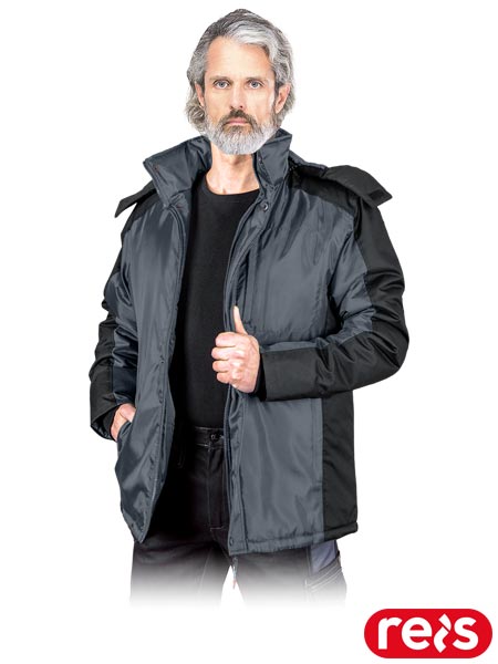 Kurtka ochronna ocieplana, męska.- materiał główny: tkanina 100% poliester Oxford 200D powlekany poliuretanem o gramaturze 120 g/m2- kontrastowe wstawki: tkanina 100% poliester Oxford 200D powlekany poliuretanem o gramaturze 120 g/m2- wyściółka 100% poliester o gramaturze 280 g/m2- pikowana podszewka 100% poliester o gramaturze 60 g/m2- zapinana na zamek błyskawiczny z dodatkowym zapięciem na napy- kołnierz w formie stójki- odsuwany kaptur z dodatkowym zapięciem na rzep dla lepszej ochrony głowy przed chłodem- dwie kieszenie w dolnej części oraz jedna na klatce piersiowej zapinane na suwak- kieszeń wewnętrzna zapinana na rzep- rękawy zakończone ściągaczem- fason: REGULAR
