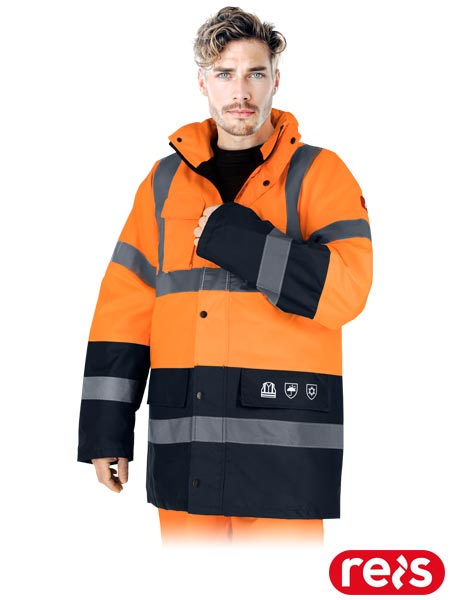 Kurtka ochronna ocieplana, męska.- tkanina: 100% poliester Oxford 300D powlekany poliuretanem o gramaturze 190 g/m2- wyściółka 100% poliester o gramaturze 160 g/m2- pikowana podszewka 100% poliester tafeta o gramaturze 55 g/m2- zapinana na dwustronny zamek błyskawiczny z dodatkowym zapięciem na napy- kołnierz w formie stójki- kaptur ściągany na troczki z możliwością zwinięcia w kołnierz i zapięcia na rzep- dwie kieszenie w dolnej części oraz kieszeń na telefon komórkowy na klatce piersiowej- ukryta kieszeń pod patką zapinana na suwak- kieszeń wewnętrzna zapinana na rzep- rękawy zakończone ściągaczami od wewnątrz- tkanina we fluorescencyjnym kolorze i pasy odblaskowe zwiększające widoczność- idealna dla drogowców i innych służb porządkowych- fason: RELAXED