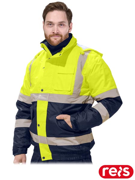 Kurtka ochronna ocieplana, męska.- tkanina: 100% poliester Oxford 300D powlekany poliuretanem o gramaturze 180 g/m2- wyściółka 100% poliester o gramaturze 180 g/m2- podszewka 100% poliester tafta o gramaturze 60 g/m2- zapinana na dwustronny zamek błyskawiczny z dodatkowym zapięciem na napy- kołnierz w formie stójki ocieplany polarem- kaptur ściągany na troczki z możliwością zwinięcia i schowania w kołnierzu- dwie kieszenie w dolnej części oraz jedna na klatce piersiowej- na lewym rękawie kieszeń zapinana na rzep- dodatkowa kieszeń wewnętrzna- dół kurtki oraz rękawy zakończone ściągaczem- tkanina we fluorescencyjnym kolorze i pasy odblaskowe zwiększające widoczność- idealna dla drogowców i innych służb porządkowych- fason: REGULAR