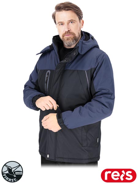 Kurtka ochronna ocieplana, męska.- tkanina: 100% poliester powlekany PCV o gramaturze 150 g/m2- wyściółka 100% poliester o gramaturze 160 g/m2- podszewka górna część polar (100% poliester) o gramaturze 150 g/m2, dolna część oraz rękawy 100% poliester tafta 210T o gramaturze 50 g/m2- zapinana na zamek błyskawiczny z dodatkowym zapięciem na napy i rzepy- kołnierz w formie stójki- odsuwany kaptur z polarową podszewką ściągany na troczki z dodatkowym zapięciem na rzep dla lepszej ochrony głowy przed chłodem- dwie kieszenie w dolnej części oraz jedna na klatce piersiowej zapinane na suwak- dodatkowa kieszeń wewnętrzna zapinana na rzep- rękawy zakończone ściągaczem z dodatkowym zapięciem na rzep- dół kurtki z możliwością ściągnięcia za pomocą troczków- odblaskowe elementy na klatce piersiowej