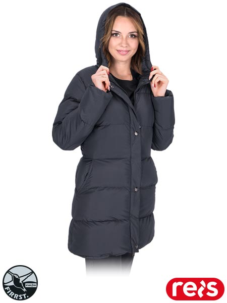 Pikowana kurtka ochronna ocieplana, damska.- tkanina: 100% poliester z powłoką AC o gramaturze 80 g/m2- wyściółka 100% poliester o gramaturze 430 g/m2- podszewka futerko 100% poliester o gramaturze 320 g/m2- zapinana na dwustronny zamek błyskawiczny z dodatkowym zapięciem na napy- kaptur z futerkową podszewką ściągany na troczki- dwie kieszenie w dolnej części