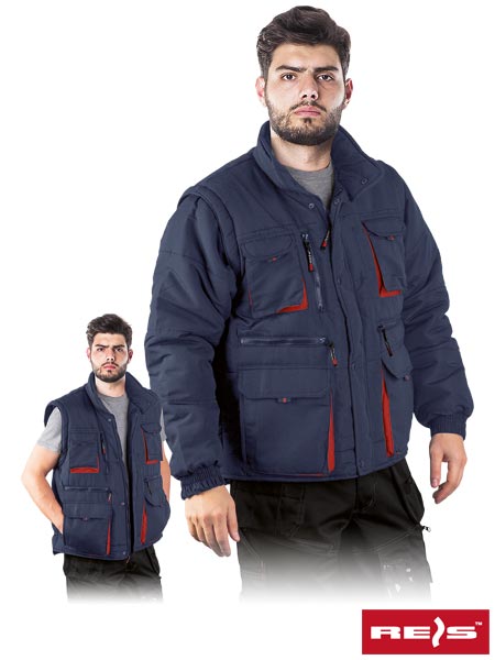 Kurtka ochronna ocieplana 2w1, męska.- tkanina: 100% poliester o gramaturze 95 g/m2- wyściółka 100% poliester o gramaturze 210 g/m2- podszewka 100% poliester o gramaturze 55 g/m2- zapinana na zamek błyskawiczny z dodatkowym zapięciem na napy- kołnierz w formie stójki- cztery kieszenie w dolnej części oraz trzy na klatce piersiowej z dodatkową wąską kieszonką na przybory np. długopis- kieszeń wewnętrzna zapinana na rzep- rękawy odpinane na suwak, zakończone ściągaczem- przedłużany tył kurtki