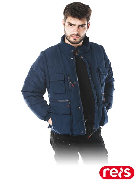 Kurtka ochronna ocieplana 2w1, męska.- tkanina: 100% poliester o gramaturze 95 g/m2- wyściółka 100% poliester o gramaturze 210 g/m2- podszewka 100% poliester o gramaturze 55 g/m2- zapinana na zamek błyskawiczny z dodatkowym zapięciem na napy- kołnierz w formie stójki- cztery kieszenie w dolnej części oraz trzy na klatce piersiowej z dodatkową wąską kieszonką na przybory np. długopis- kieszeń wewnętrzna zapinana na rzep- rękawy odpinane na suwak, zakończone ściągaczem- przedłużany tył kurtki