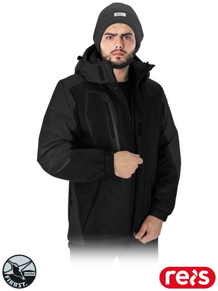 Kurtka ochronna ocieplana, męska.- tkanina: 100% poliester powlekany PCV o gramaturze 150 g/m2- wyściółka 100% poliester o gramaturze 160 g/m2- podszewka górna część polar (100% poliester) o gramaturze 150 g/m2, dolna część oraz rękawy 100% poliester typu tafta 210T o gramaturze 50 g/m2- zapinana na zamek błyskawiczny z dodatkowym zapięciem na napy i rzepy- kołnierz w formie stójki- odsuwany kaptur z polarową podszewką ściągany na troczki z dodatkowym zapięciem na rzep dla lepszej ochrony głowy przed chłodem- dwie kieszenie w dolnej części zasłonięte patką oraz jedna na klatce piersiowej zapinane na suwak- dodatkowa kieszeń wewnętrzna zapinana na rzep- rękawy zakończone ściągaczem z dodatkowym zapięciem na rzep- dół kurtki z możliwością ściągnięcia za pomocą troczków- odblaskowe elementy na klatce piersiowej