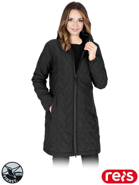 Pikowana kurtka ochronna ocieplana w wersji przedłużanej, damska.- tkanina: 100% poliester o gramaturze 83 g/m2- wyściółka 100% poliester o gramaturze 160 g/m2- podszewka 100% poliester o gramaturze 60 g/m2- zapinana na dwustronny zamek błyskawiczny- kaptur- dwie kieszenie w dolnej części zapinane na suwak- kieszeń wewnętrzna- rękawy wykończone elastyczną lamówką